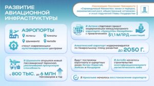Развитие авиационной инфраструктуры остается одним из приоритетов транспортной политики Казахстана. В соответствии с Общенациональным планом по реализации Послания Президента ведущие аэропорты страны – Астаны, Алматы, Шымкента и Актобе – развиваются как современные мультимодальные центры, предоставляющие полный спектр логистических услуг.